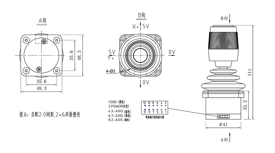 導(dǎo)線顏色順序 紅色=5 VDC電源正極 黑色=電源負(fù)極 藍(lán)色=X軸 黃色=Y軸 綠色=Z軸 白色=開(kāi)關(guān) 橙色=開(kāi)關(guān)