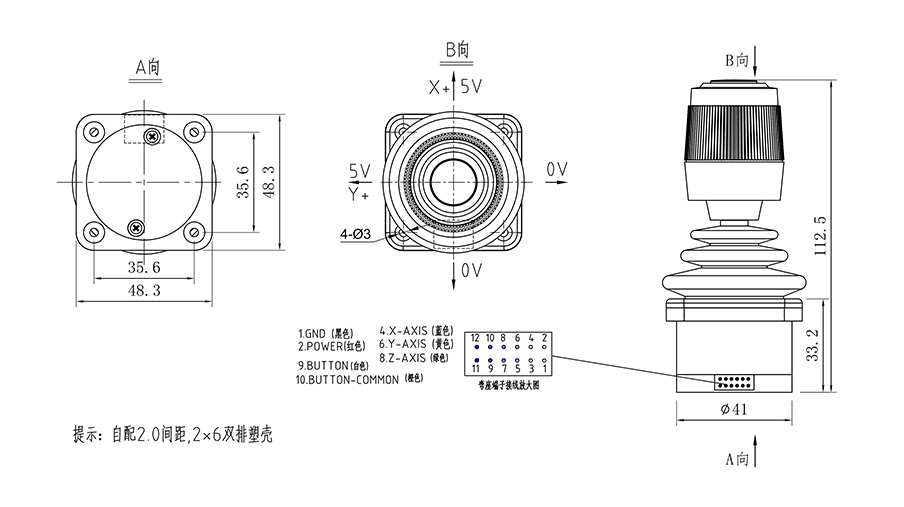 導(dǎo)線顏色順序 紅色=5 VDC電源正極 黑色=電源負(fù)極 藍(lán)色=X軸 黃色=Y軸 綠色=Z軸 白色=開關(guān) 橙色=開關(guān)